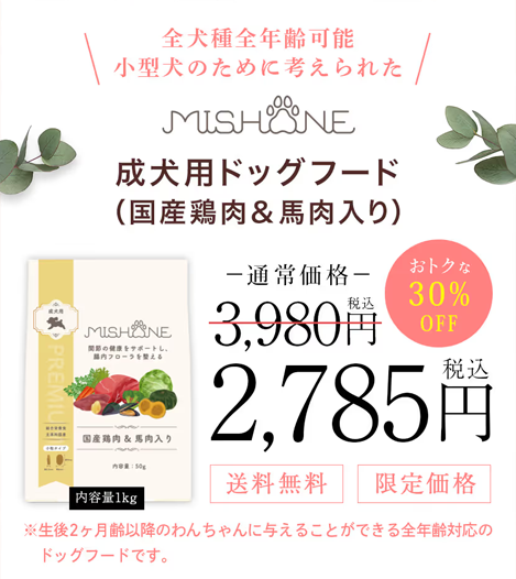 パピーの頃はブリーダー様から引き継いだフードを与えていましたが、成犬に近づくにつれ、次第に食べムラが顕著になってきました。安心・安全で体に良いフードを与えたいと思っていた時「ミシュワン」に出会いました。 関節の健康を維持する「緑イ貝」も配合されてとても心強いです! 長く与え続けたい信頼できるフードです。